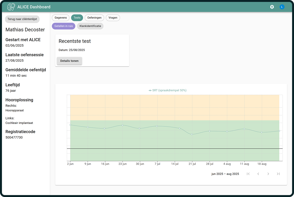 ALICE combineert digitale hoortraining met professionele opvolging. Zo kan je cliënten zelfstandig laten oefenen, terwijl jij hun vooruitgang monitort via het online dashboard.